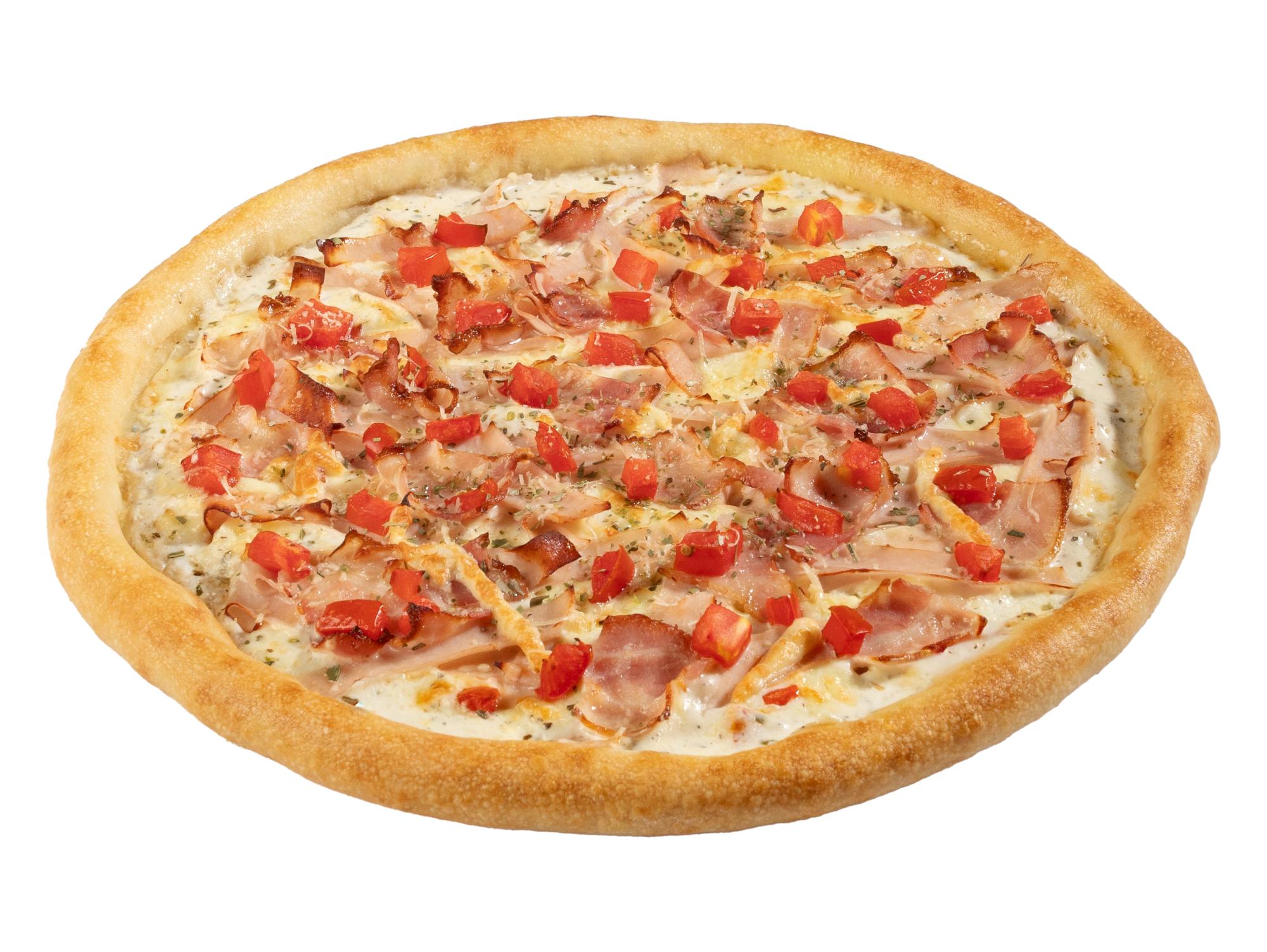 Пицца на тонком тесте с моцареллой, ветчиной из индейки, свежими шампиньонами, сочными томатами, пармезан, орегано и фирменным белым соусом от Перепечей.