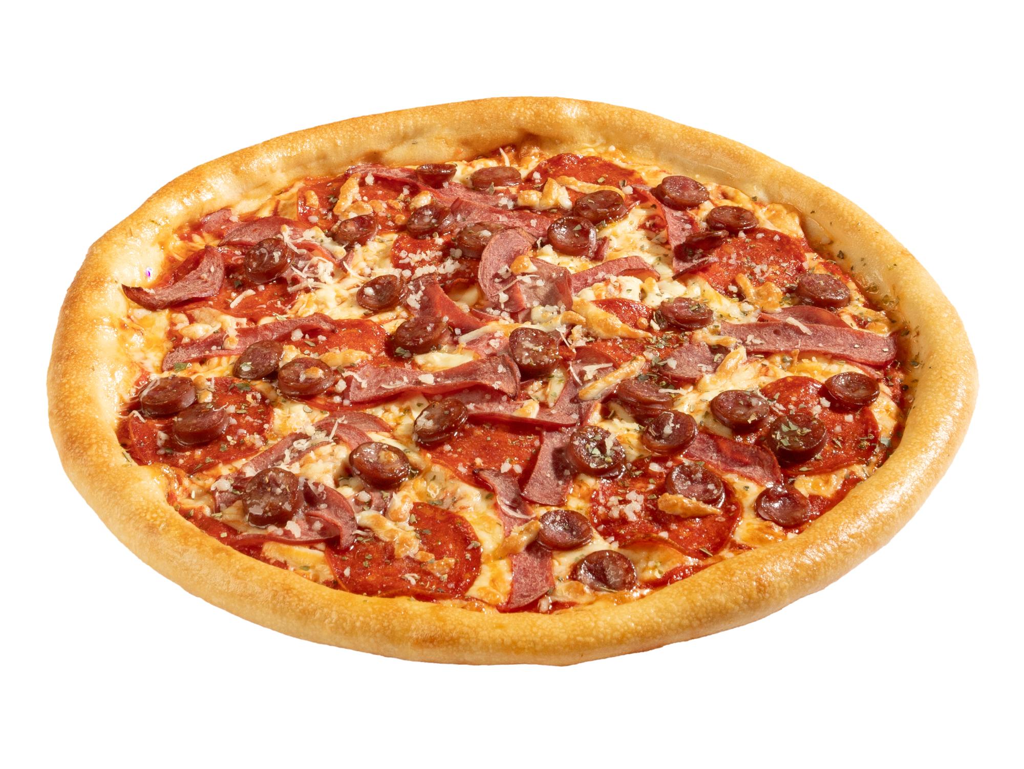 Мясная пицца на тонком тесте с пикантной пепперони, охотничьими колбасками, копчёной говядиной, моцареллой, орегано, пармезан и фирменным томатным соусом.