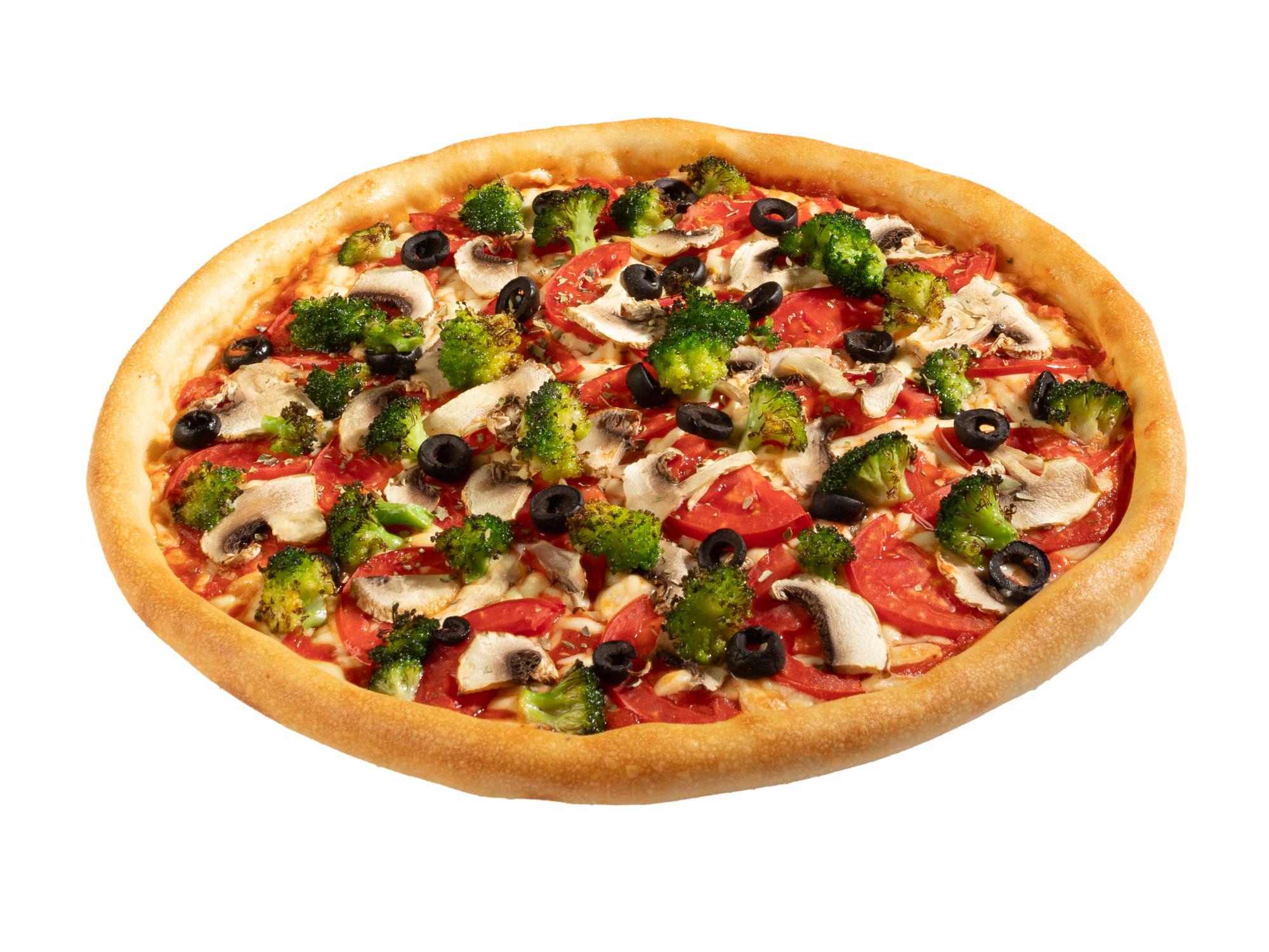Пицца на на тонком тесте с моцареллой, сочными томатами, брокколи, шампиньонами, маслинами, орегано и фирменным томатным соусом.